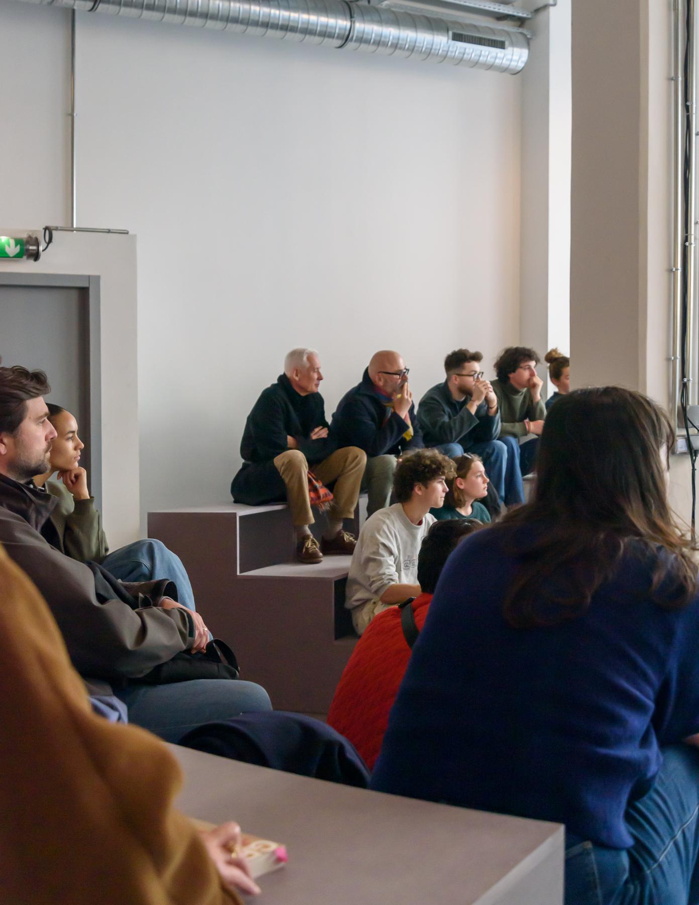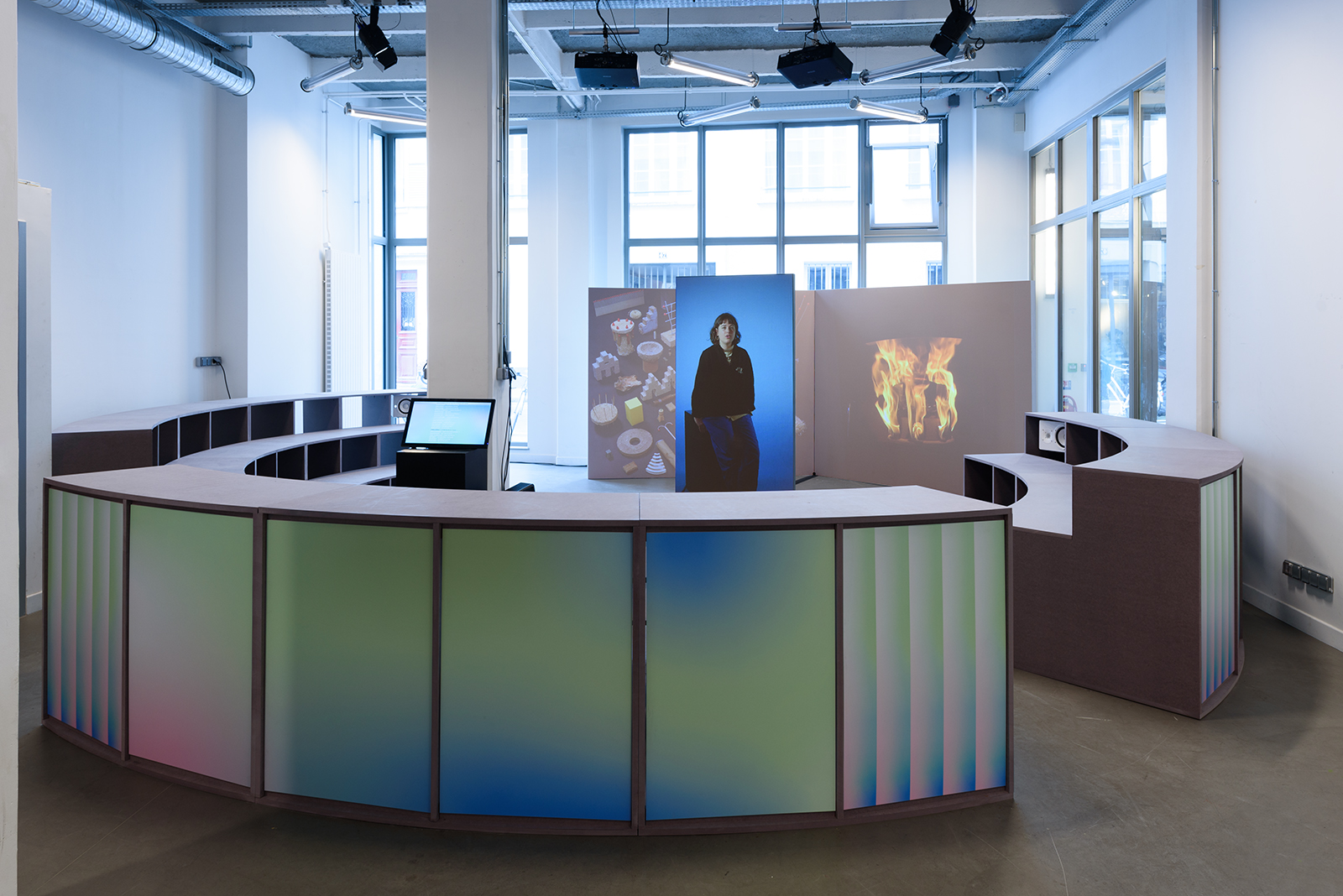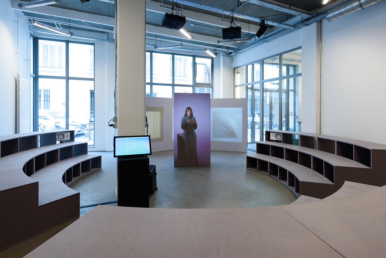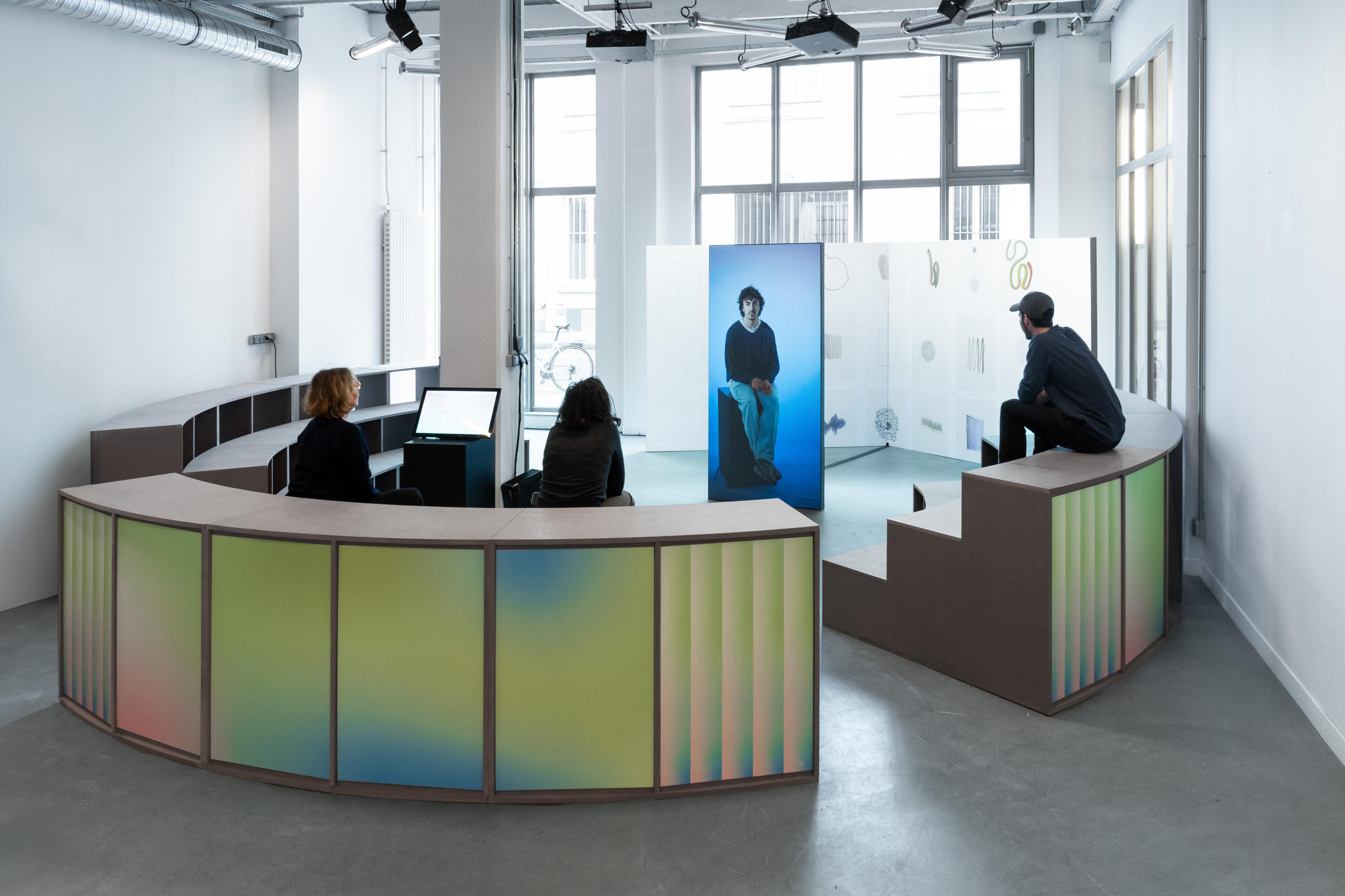 À mi-chemin entre place publique et agora, la scénographie met en scène les diplômé·es de l’ENSCI (année 2023) s’adressant au public par un unique dispositif : à la fois virtuel dans un format d’exposition audiovisuelle et physique lors de soirées thématiques.