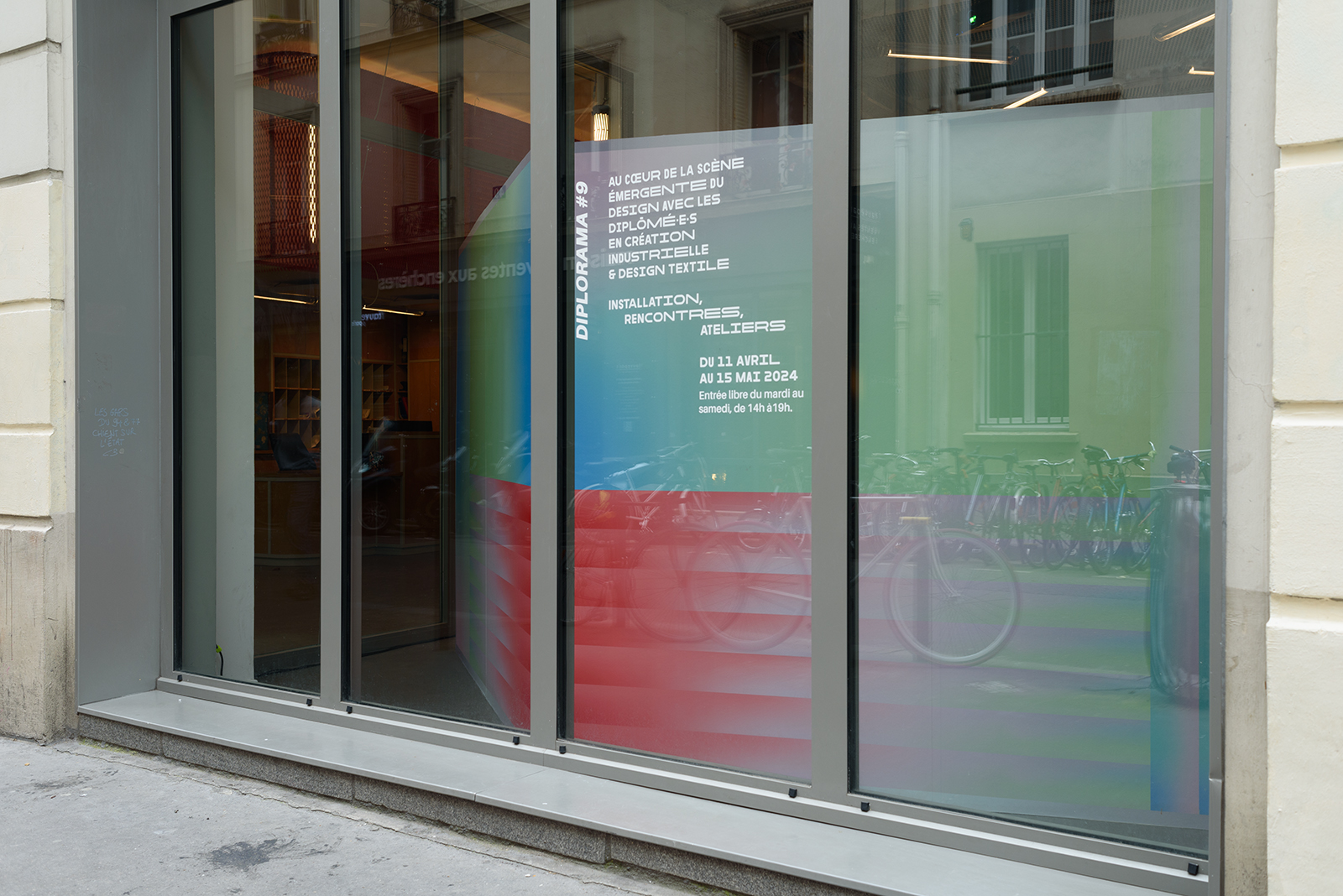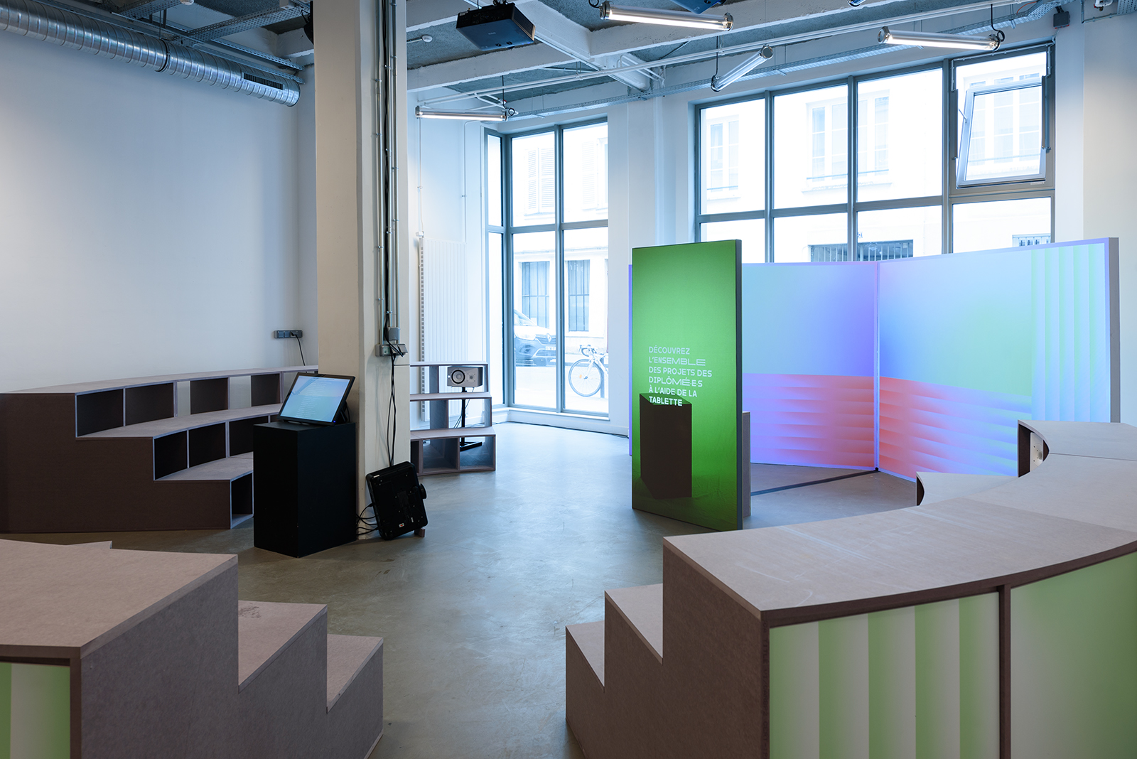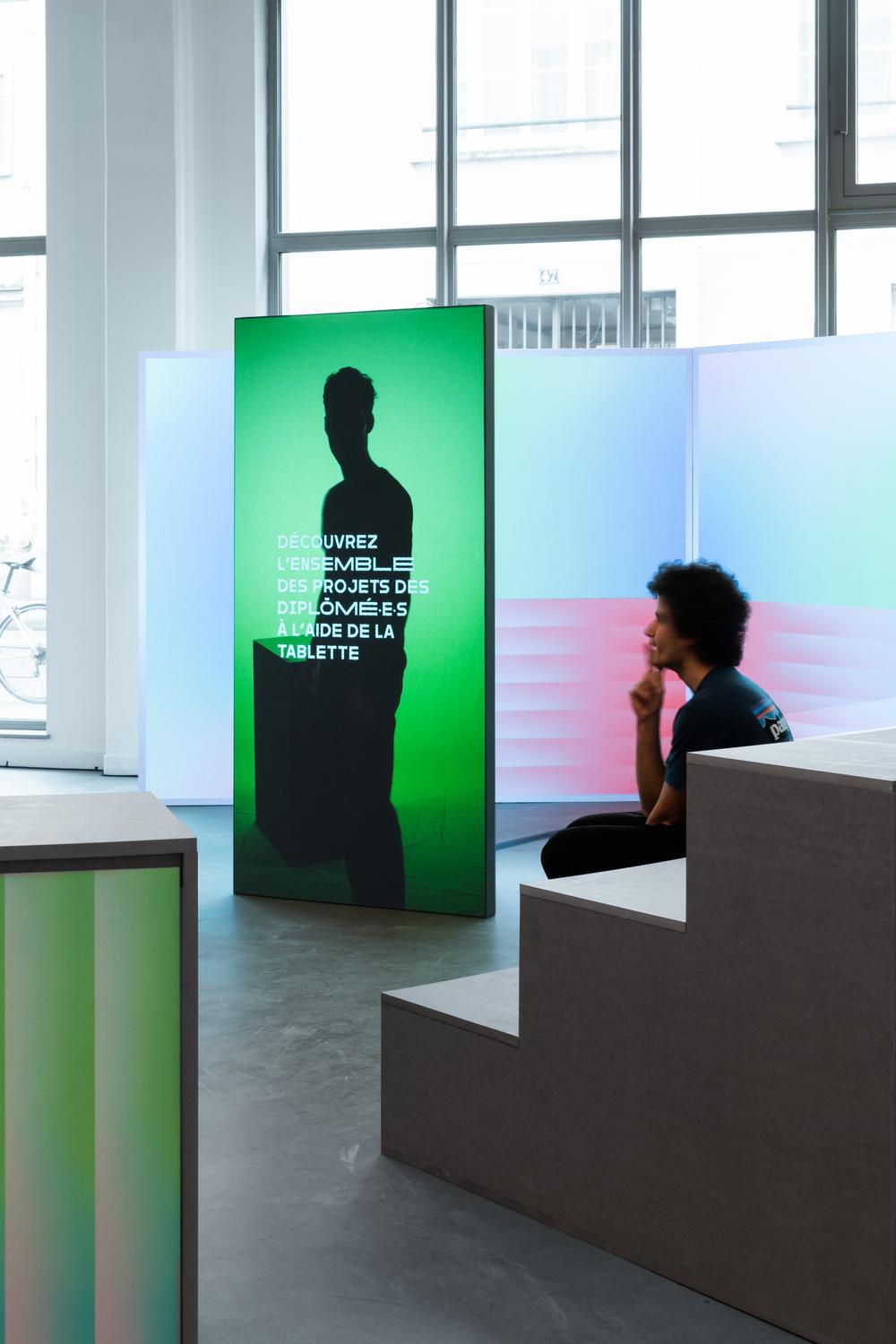Halfway between a public square and an agora, the scenography showcases ENSCI graduates (year 2023) addressing the public through a unique device: both virtual in an audiovisual exhibition format and physical during themed evenings.